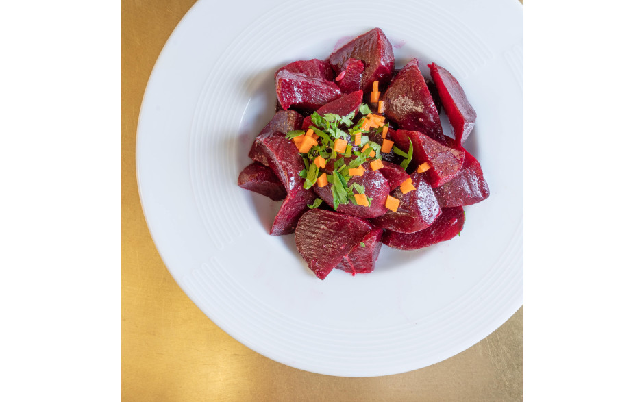 Salade de betteraves, feta, roquette, noix, groseilles, figues et grenades.