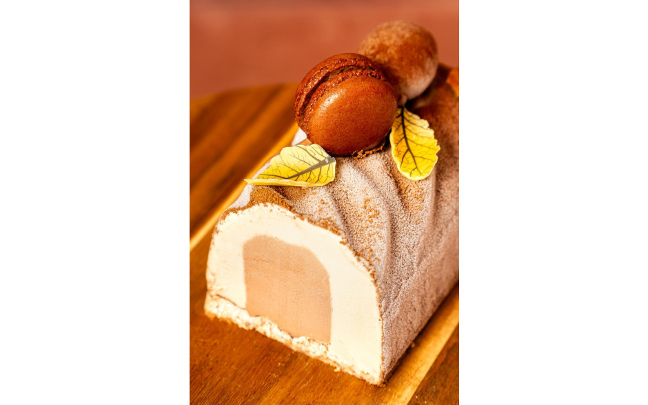 Crème glacée au chocolat intense, cœur fondant à la noisette sublimé d’un macaron au chocolat, la gourmandise signature des fêtes.